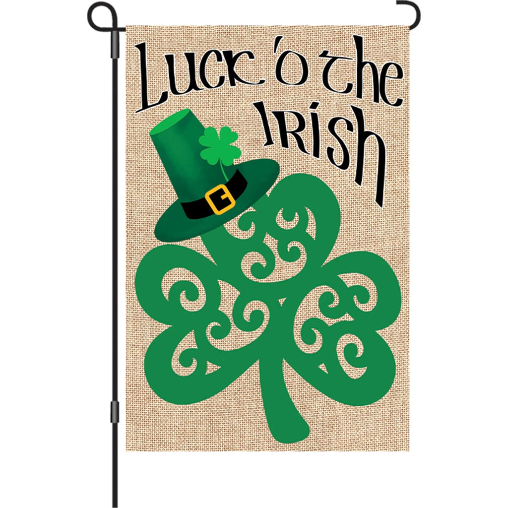 Flag shows a shamrock on printed burlap and reads: Luck o’ the Irish